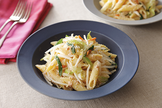 めんたいパスタにたっぷり野菜でバランスアップ!食べごたえも十分です。