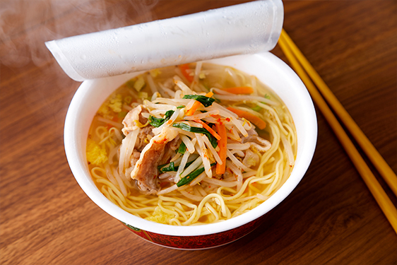 - ②熱いうちに、しょうゆをふりかけ、豆板醤、ごま油を混ぜる。カップ麺の上にたっぷりとのせる。