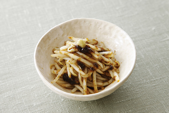 ※通常はゆでたもやしが熱いうちにたれで和えますが、この和えだれは海苔の佃煮やわさびが入っているので、もやしが冷めてから和えます。ただし、ゆでたもやしを水につけるのは厳禁!
